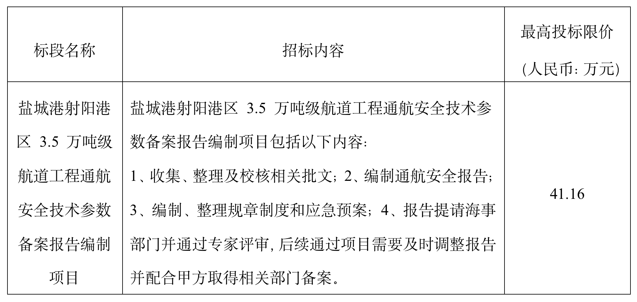 (5)項目標段劃分:鹽城港射陽港區(qū) 3.5 萬噸級航道工程通航安全技術參數(shù)備案報告編制項目共劃分1個標段,標段信息如下: