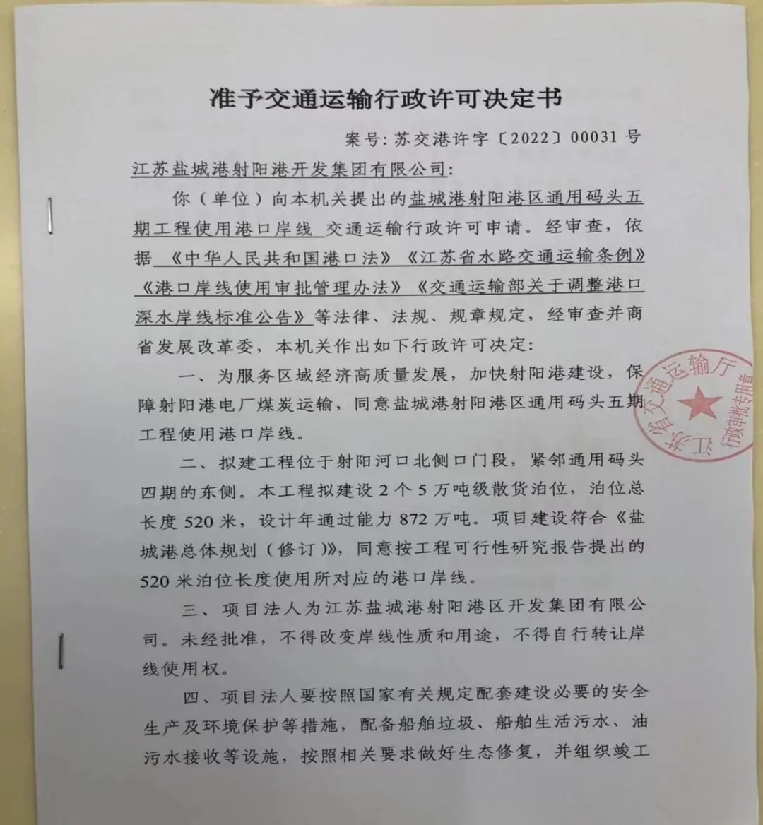 【項目大推進】鹽城港射陽港區(qū)通用碼頭五期工程岸線獲批