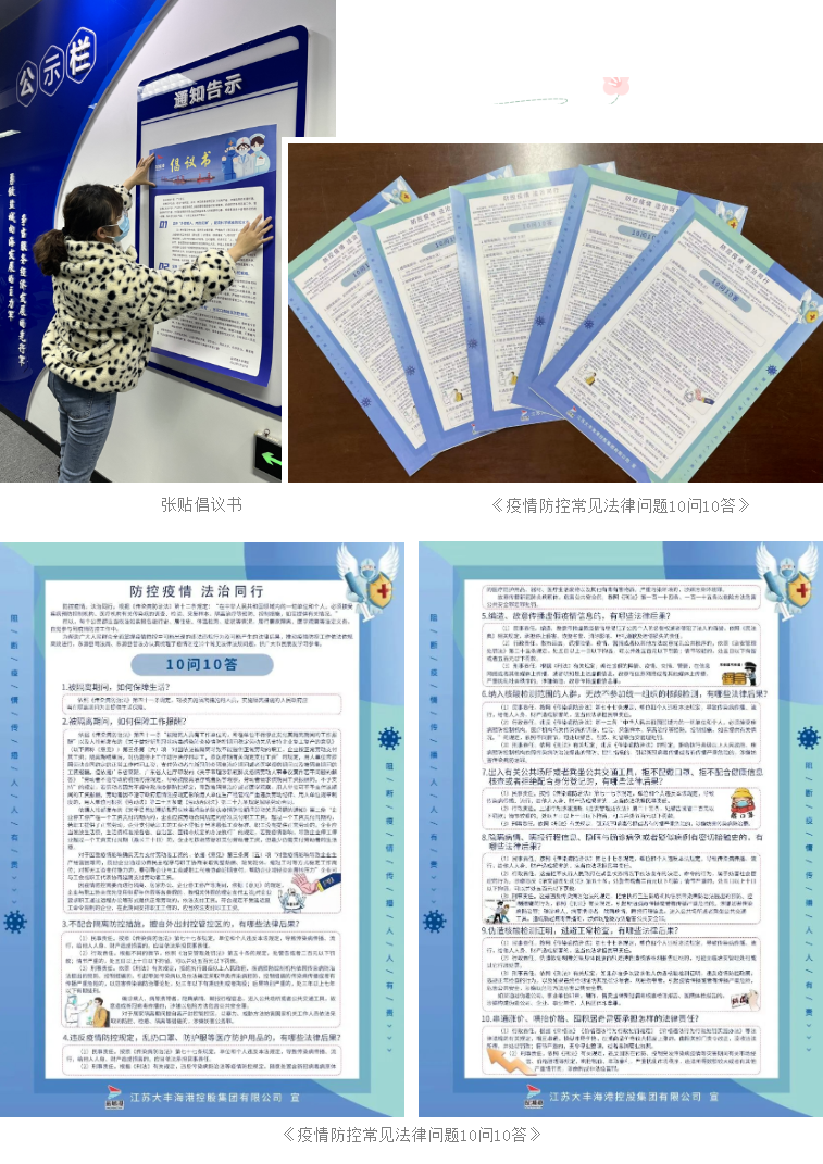 按照“該亮亮起來、該響響起來、該貼貼起來、該發(fā)發(fā)到位”的防疫宣傳要求,大豐港區(qū)運(yùn)用“網(wǎng)、端、微、屏”等媒體平臺(tái),全方位、多聲部宣傳《防控新冠肺炎疫情相關(guān)注意事項(xiàng)》《中華人民共和國傳染病防治法》等法律法規(guī),做到普法宣傳全覆蓋,并將疫情防控宣傳資料、《疫情防控常見法律問題10問10答》等材料發(fā)放到各級(jí)子公司,要求在重點(diǎn)場所張貼“防控疫情、法治同行”、“全民佩戴口罩”的宣傳海報(bào),依法強(qiáng)化新型冠狀病毒感染的肺炎疫情防控,切實(shí)履行疫情防控普法宣傳責(zé)任,為堅(jiān)決打贏疫情防控阻擊戰(zhàn)創(chuàng)造良好法制氛圍。