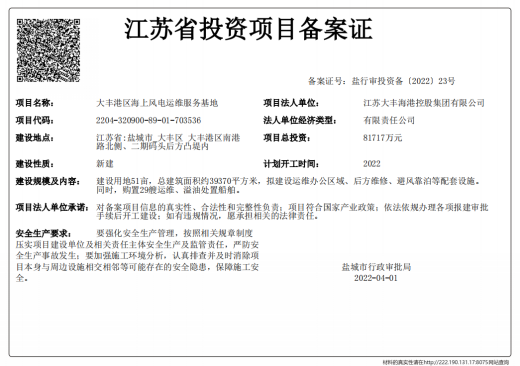 鹽城港大豐港區(qū)海上風電運維服務基地項目為市城鄉(xiāng)建設重點房建項目之一,位于大豐港區(qū)南港路北側(cè)、物聯(lián)大廈東側(cè),二期碼頭后方凸堤內(nèi),建設用地51畝,建筑面積約39370㎡,項目總投資81717萬元,擬建設運維辦公區(qū)、維修車間、安全培訓中心等,后期部分建設避風靠泊等配套設施;同時購置29艘運維、溢油處置船舶,通過建立運維基地,統(tǒng)一運維,打造專業(yè)運維隊伍,共享運維配套資源及數(shù)據(jù),降低鹽城地區(qū)各個海上風電的運維成本,促進海上風電高效運行,帶動風電產(chǎn)業(yè)鏈的發(fā)展。