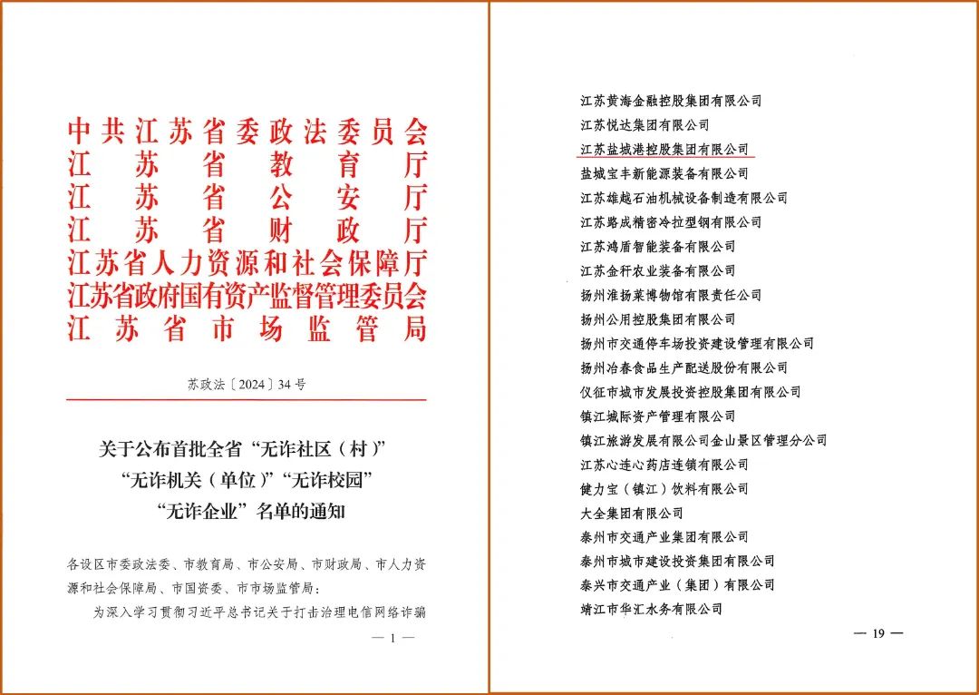 近日,首批全省“無詐社區(村)”“無詐機關(單位)”“無詐校園”“無詐企業”名單公布,鹽城港集團被授予省級“無詐企業”稱號。